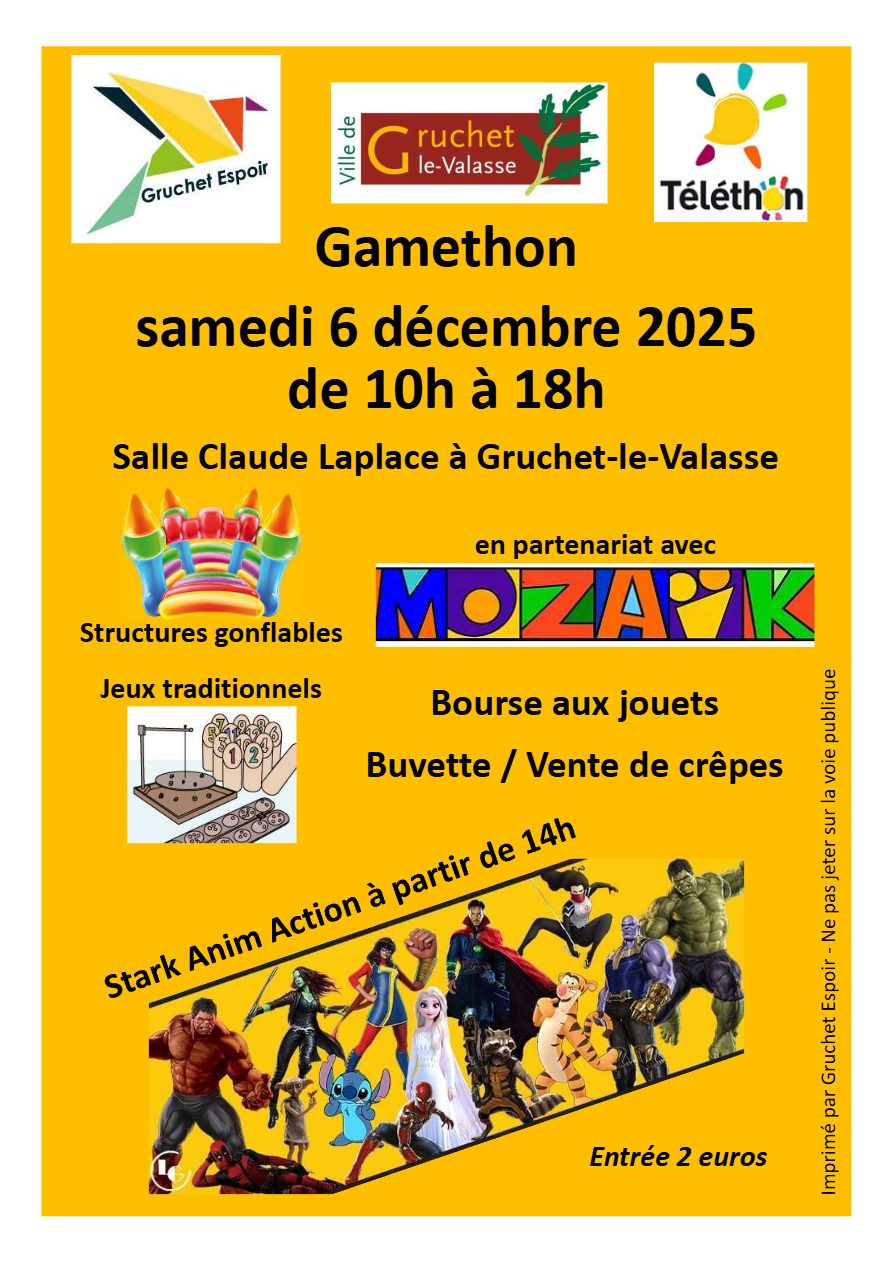 Samedi 6 décembre de 10h00 à 18h00 salle Claude Laplace : Gamethon : Structures gonflables, jeux traditionnels, bourse aux jouets, buvette, vente de crêpes et Stark Anim Action à partir de 14h00. Entrée 2 €