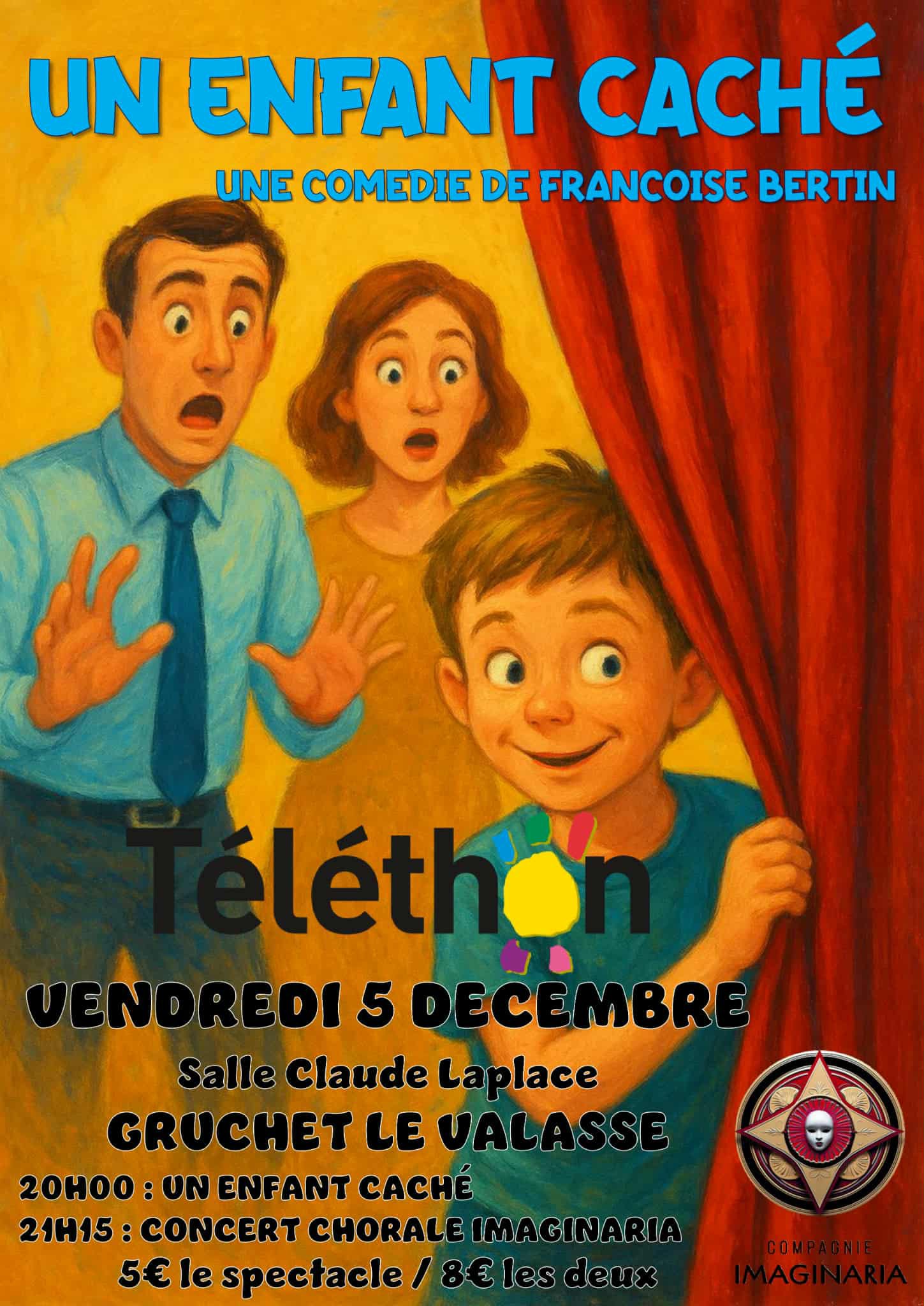 Vendredi 5 décembre à 20h00 salle Claude Laplace : Théâtre /comédie « Un enfant caché » suivi du concert de la chorale Imaginiaria : 5 € l’entrée pour 1 spectacle / 8 € l’entrée pour les 2 spectacles. Billetterie sur place.