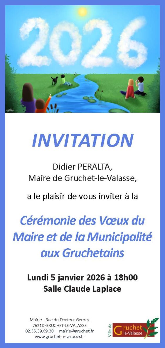 Didier PERALTA, Maire de Gruchet-le-Valasse, a le plaisir d’inviter la population à la Cérémonie des Vœux du Maire et de la Municipalité aux Gruchetains qui aura lieu le lundi 5 janvier 2026 à partir de 18h00, salle Claude Laplace.