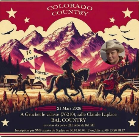 L’association Colorado Country organise un Bal Country, animé par Niny, samedi 21 mars à la salle Claude Laplace. Ouverture des portes à 18h00, début du bal à 19h00.