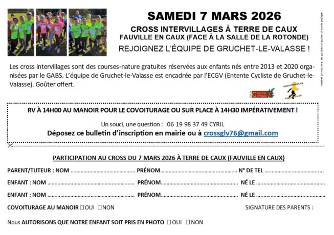 Les cross intervillages sont des courses-nature gratuites réservées aux enfants nés entre 2013 et 2020 organisées par le GABS. L’équipe de Gruchet-le-Valasse est encadrée par l’ECGV (Entente Cycliste de Gruchet-le-Valasse). Goûter offert.