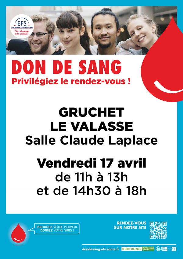 L’Etablissement du Sang Français (EFS) organise une collecte de sang vendredi 17 avril 2026 de 11h00 à 13h00 et de 14h30 à 18h00 salle Claude Laplace.